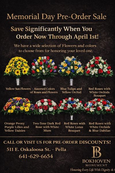 Memorial Day is a time to honor and remember those we love. By pre-ordering your Memorial Day flowers now, you can take advantage of significant savings while ensuring the best selection. Bokhoven Monument offers a large variety of beautiful flower bouquets and monument saddles available in our store, along with many additional styles and colors that can be specially ordered if you place your order by April 1. Take advantage of our pre-order pricing — Bouquets normally $65 are just $50, and Monument Saddles normally $75 are only $60. Stop by and see the selection or place your order early to make sure your memorial is beautifully decorated this Memorial Day.